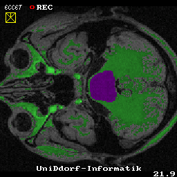 In den mittleren Schichten der MRT-Daten ist keine klare Grenze zwischen Kleinhirn und Hirnstamm zu erkennen; in den höheren und in den tieferen dagegen schon. In diesen Schichten ist es leicht, auf manuelle oder auch halbautomatische Weise den Querschnitt des Hirnstamms (oder seine Kontur) zu markieren.