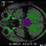 Sehr viel schwieriger ist die Abgrenzung von Kleinhirn und Hirnstamm. Die Kleinhirnschenkel sind breite Verbindungsbahnen zwischen Kleinhirn und Hirnstamm, in denen anhand der Grauwerte keine Grenze auszumachen ist. In dem Bild rechts sind alle Bildpunkte, deren Grauwert in einem vorgegebenen Intervall liegt, grün markiert. Die Intervallgrenzen sind so gewählt, dass der Hirnstamm gerade eben in dem grünen Bereich enthalten ist. Wie man sieht, sind dann auch Teile des Kleinhirns grün gefärbt, weil ihre Grauwerte ebenfalls in dem gewählten Intervall liegen.